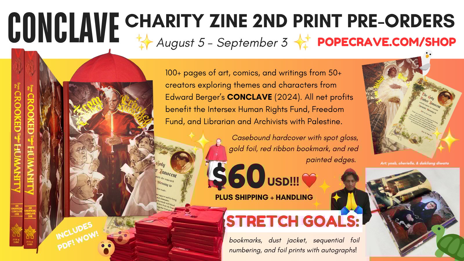 ✨100+ pages of art, comics, and writings from 50+ creators exploring themes and characters from Edward Berger’s CONCLAVE (2024). All net profits benefit the Intersex Human Rights Fund, Freedom Fund, and Librarian and Archivists with Palestine.