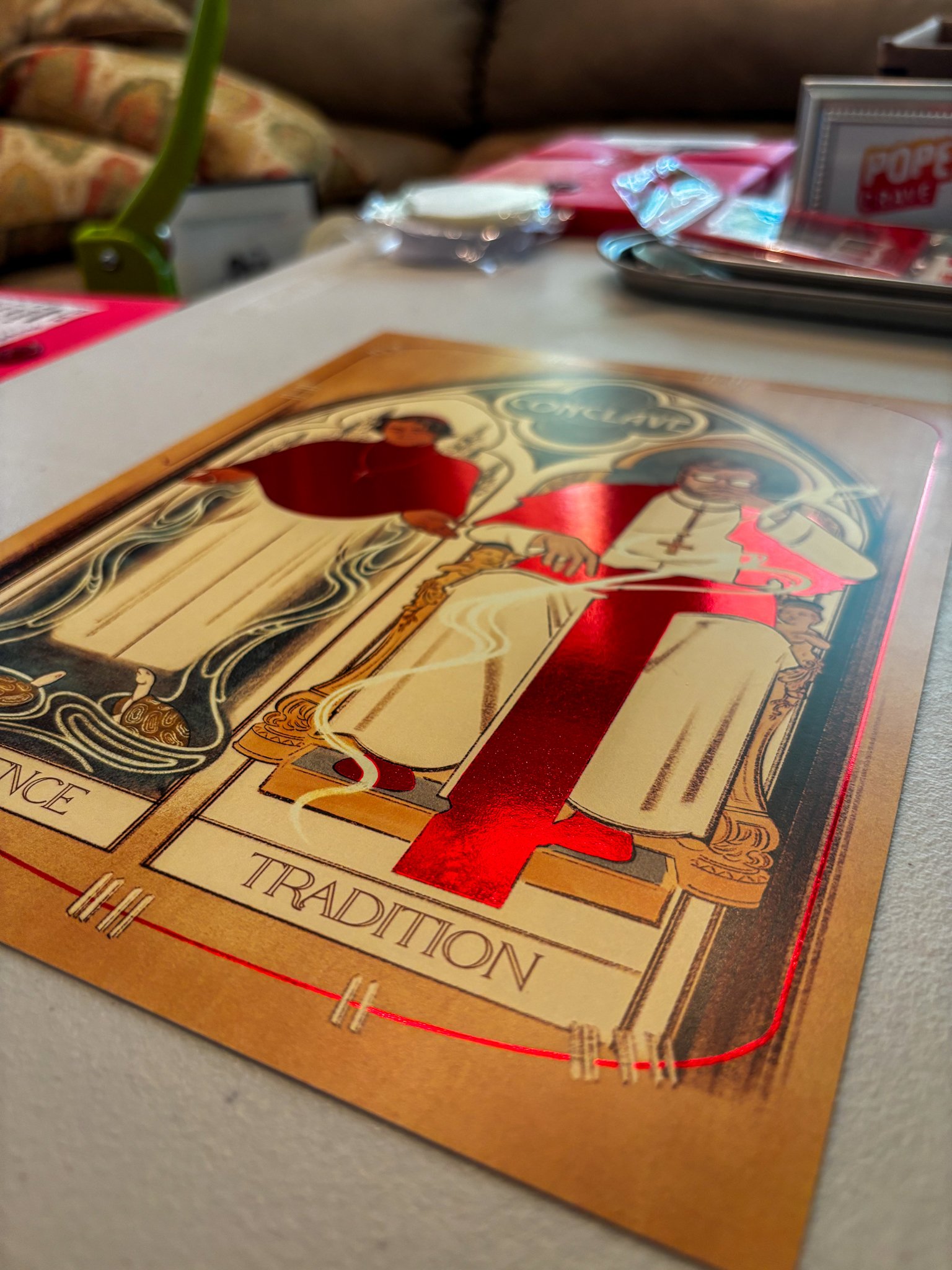 Discounted B-grade 8.5" x 11" red and gold foil prints on heavy cardstock.